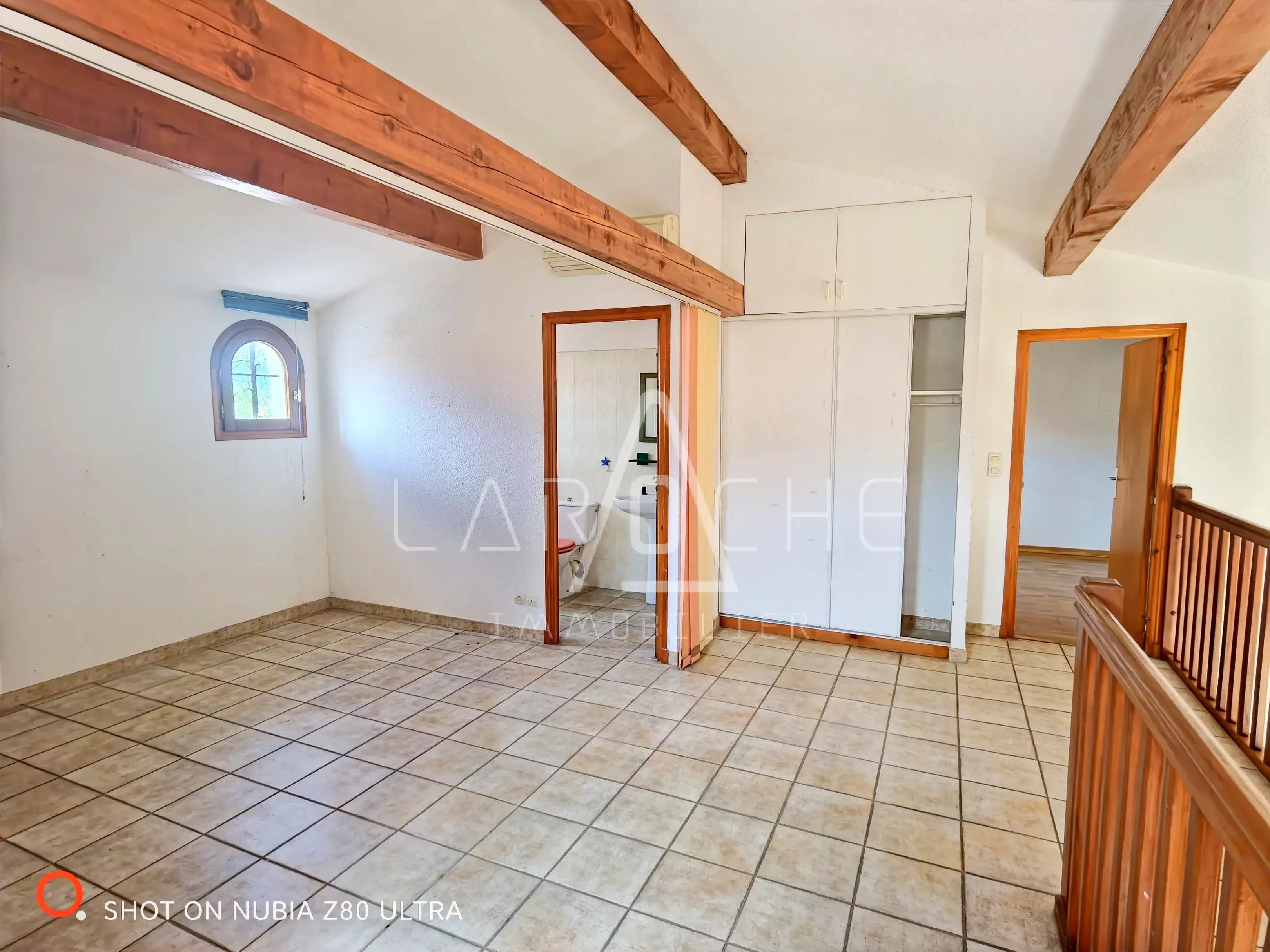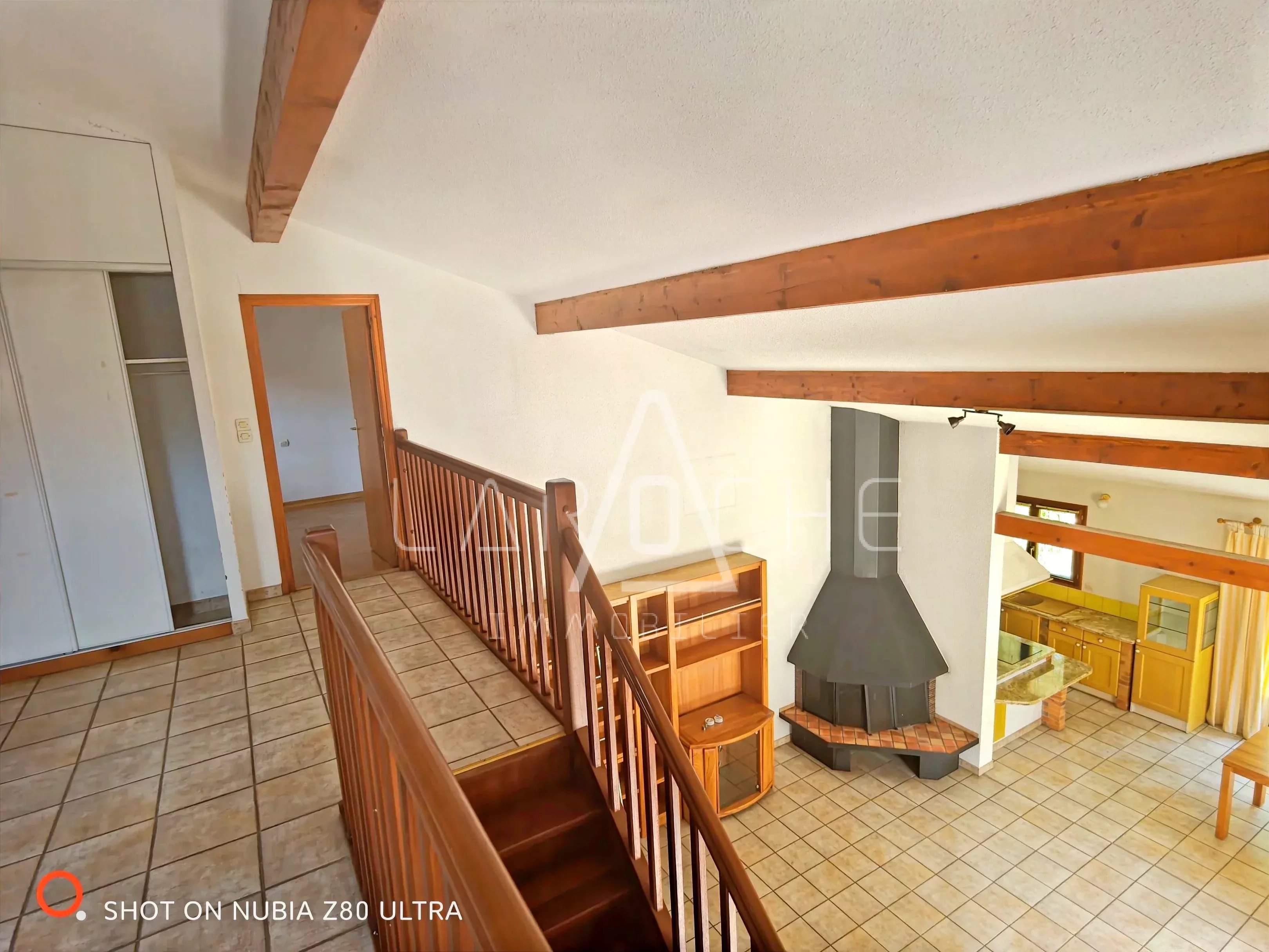 A l'étage : une grande mezzanine, une chambre, une salle d'eau avec toilettes et un grenier.