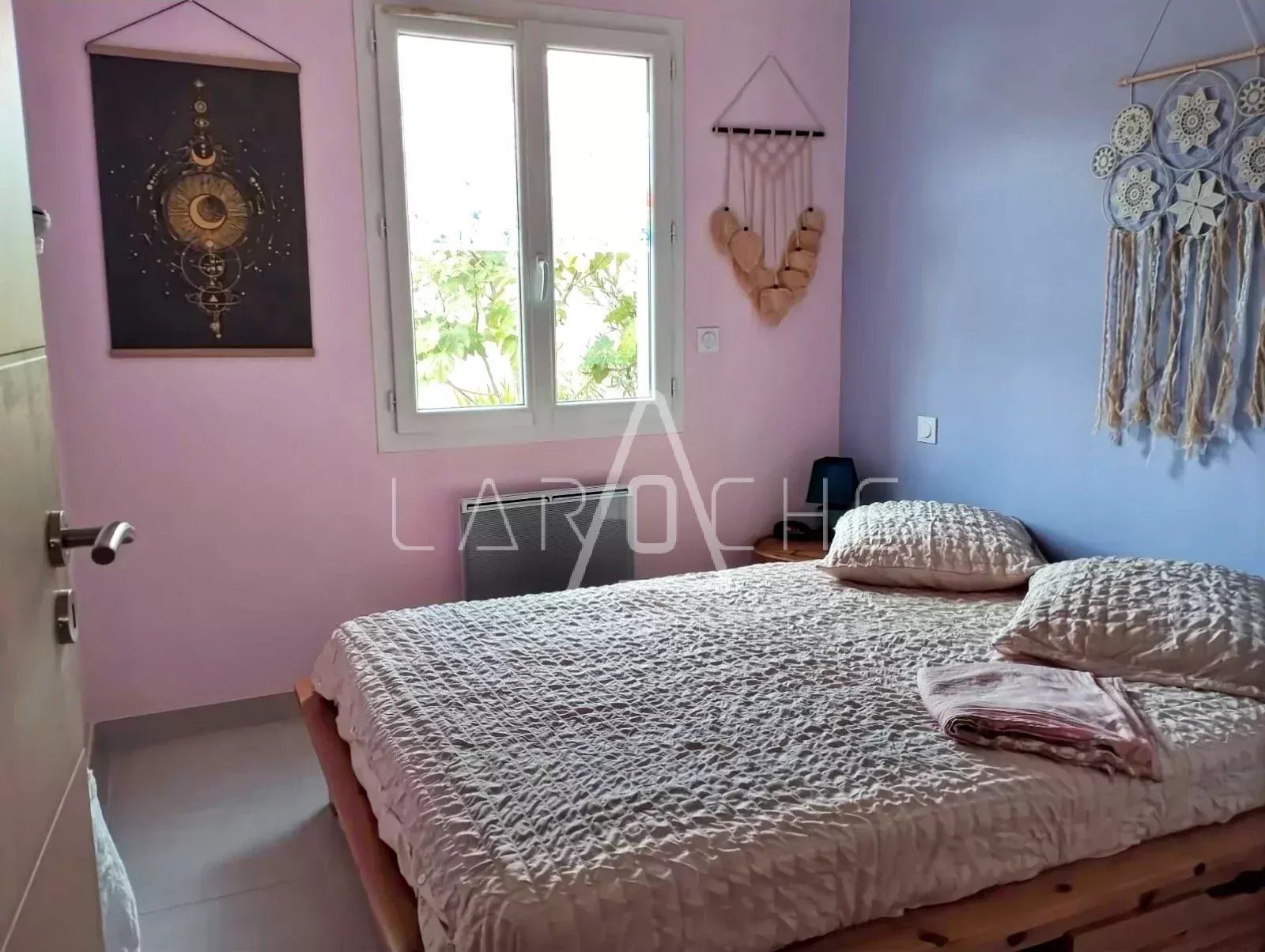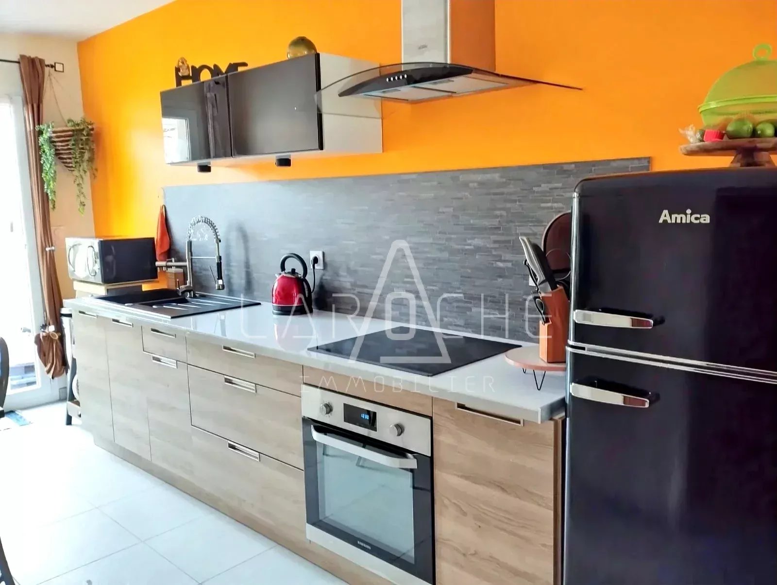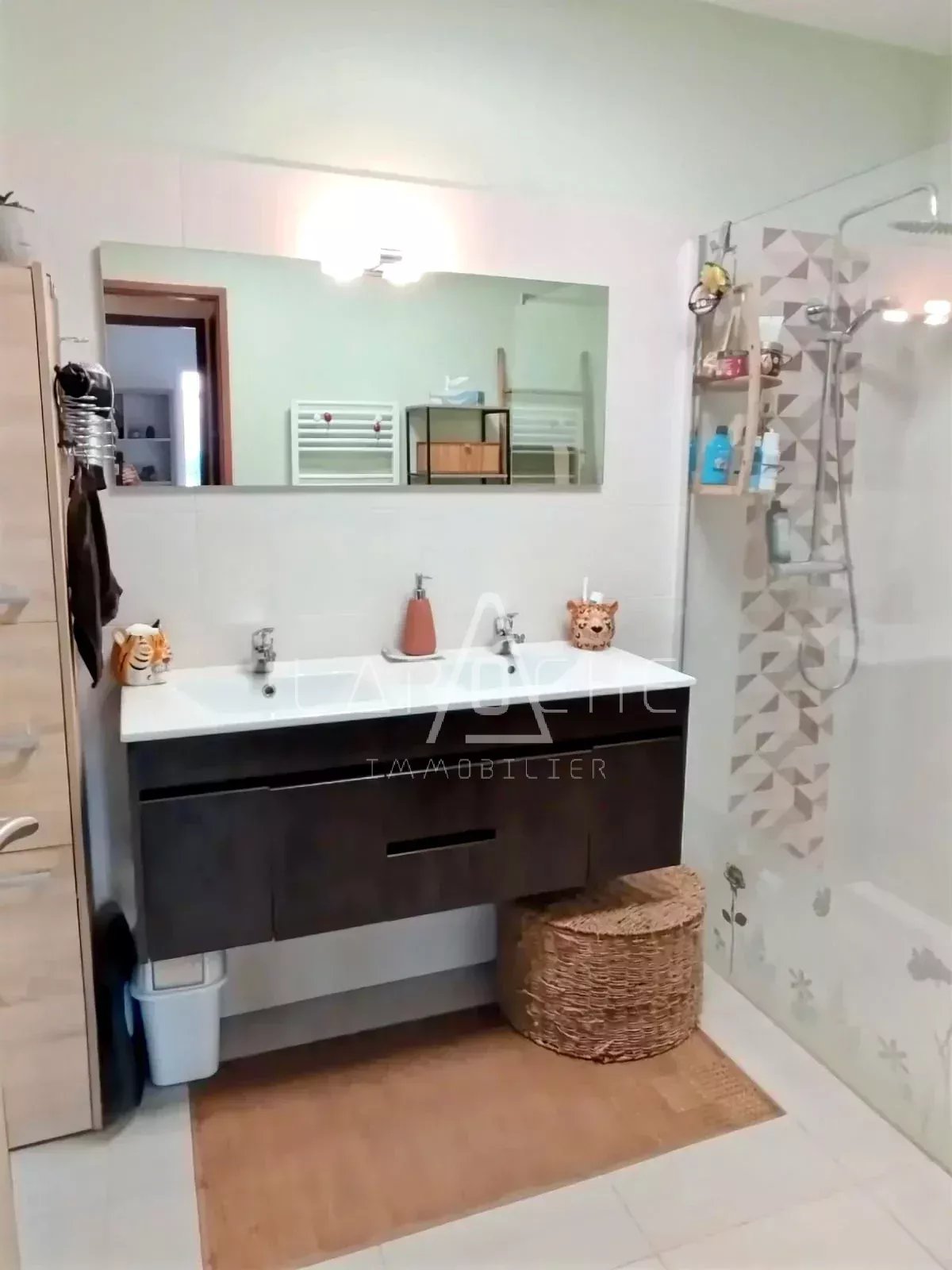 Sa grande pièce de vie est lumineuse et ouverte sur une cuisine équipée et moderne, deux chambres avec des espaces de rangement, une salle de bains et toilettes. A noter : un garage, un jardin et une magnifique terrasse sans vis à vis.