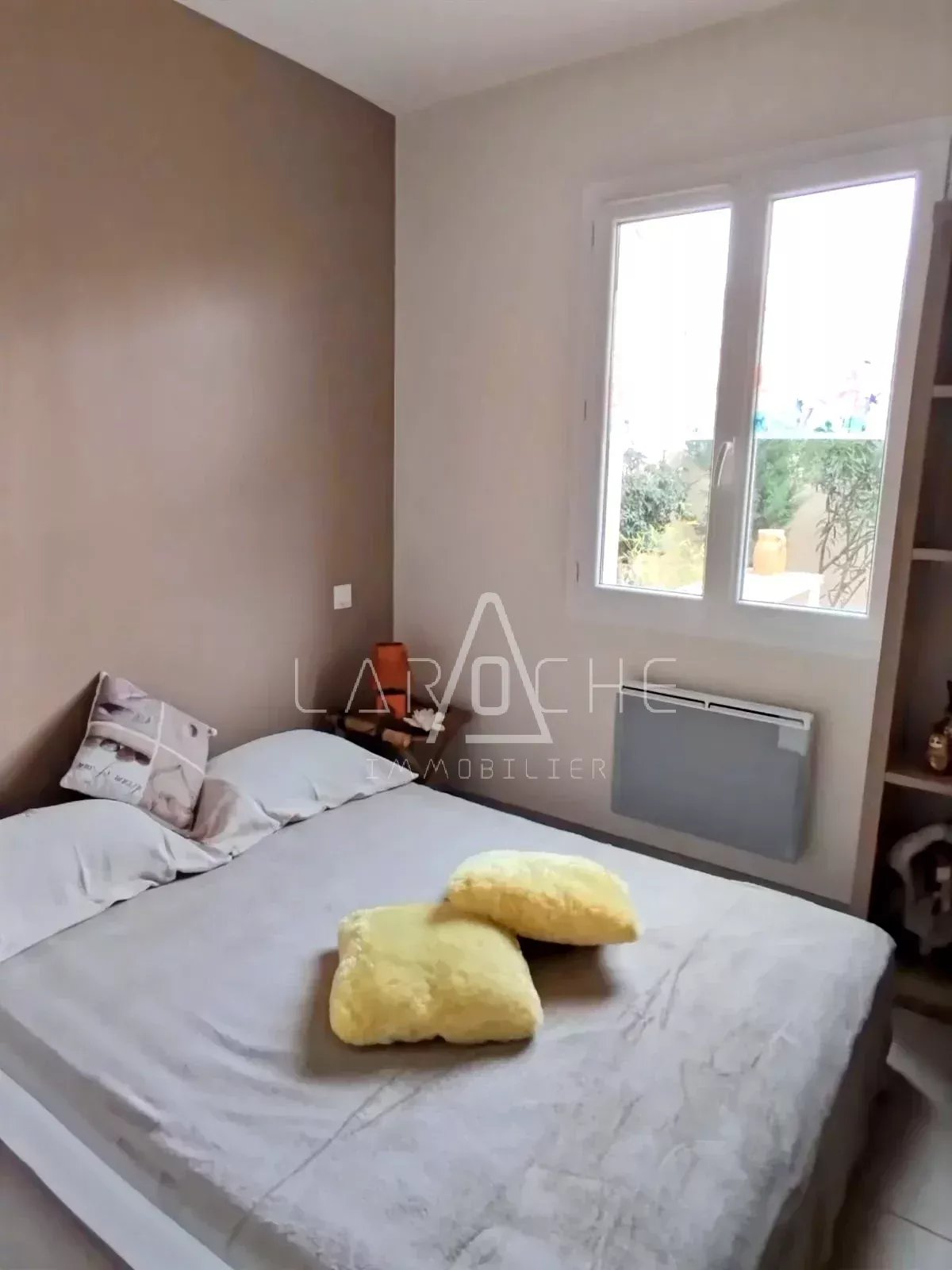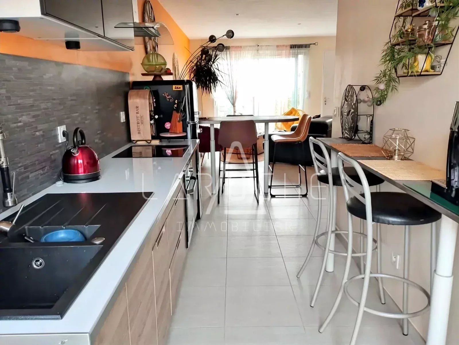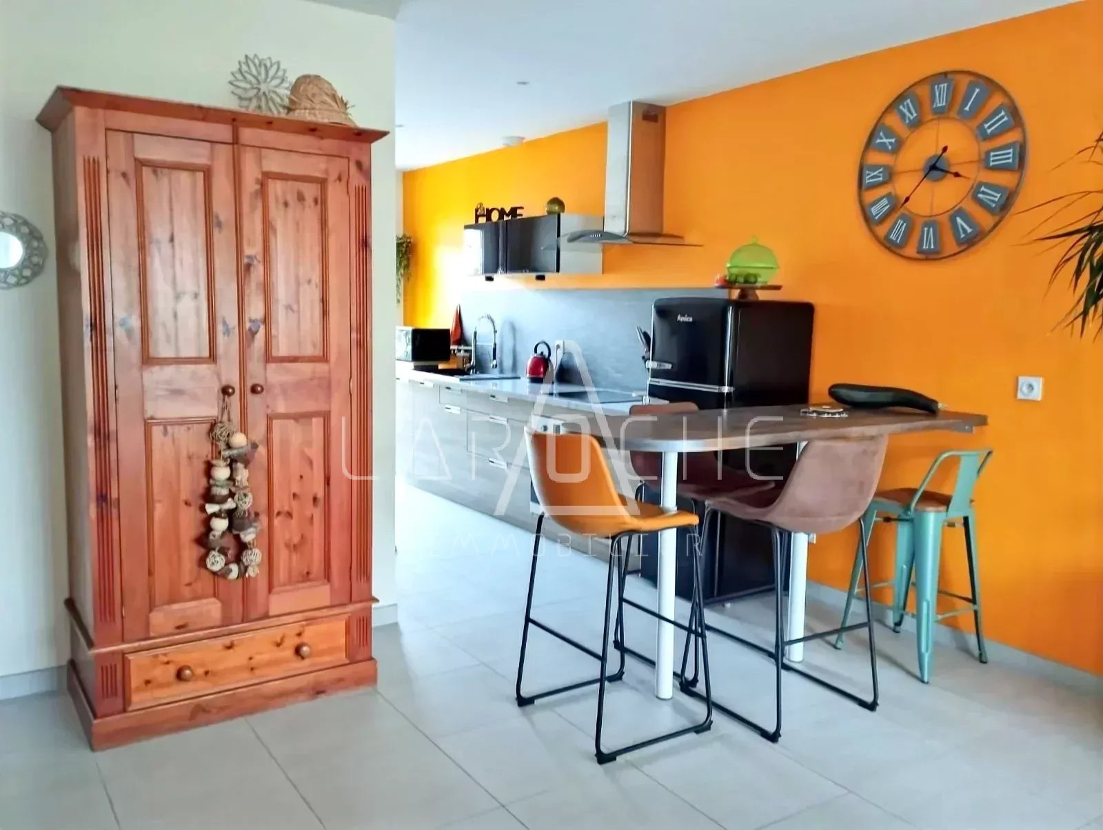 Sa grande pièce de vie est lumineuse et ouverte sur une cuisine équipée et moderne, deux chambres avec des espaces de rangement, une salle de bains et toilettes. A noter : un garage, un jardin et une magnifique terrasse sans vis à vis.